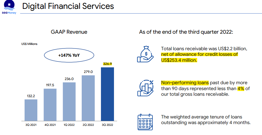 4) Its financial services arm, Sea Money is growing fast. The Non-performing loan is less than 4% of their loan book. They had allocated USD 253.4 million of allowance for credit losses out of their USD 2.2 billion loan book(11.5%).