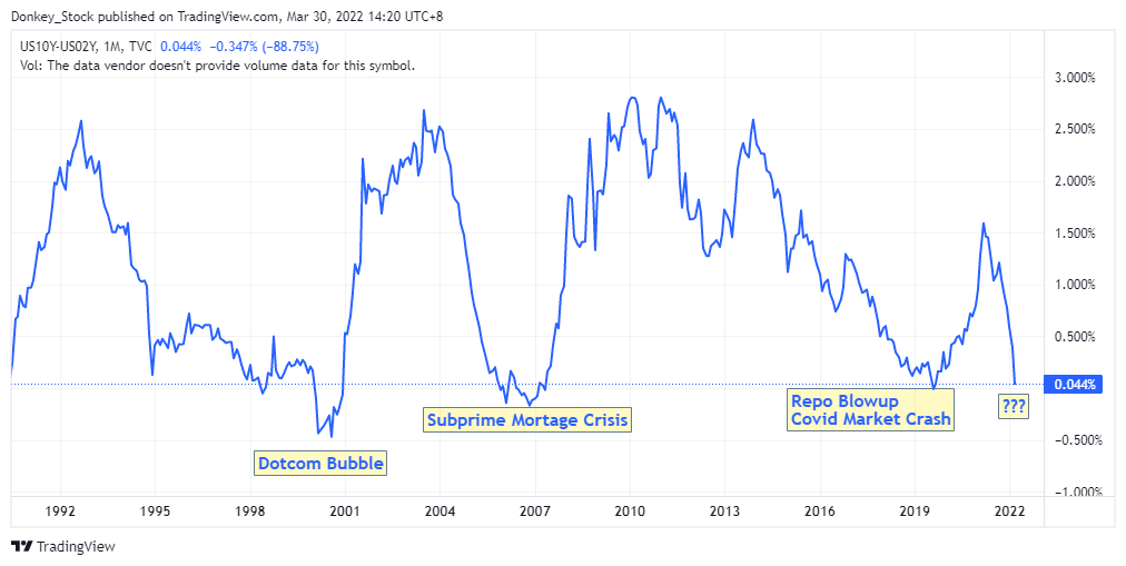 A closely monitored section of the U.S. Treasury yield curve (Spread between 2Y & 10Y) inverted on Tuesday for the first time since September 2019, a reflection of market concerns that the Federal Reserve could tip the economy into recession as it battles soaring inflation.