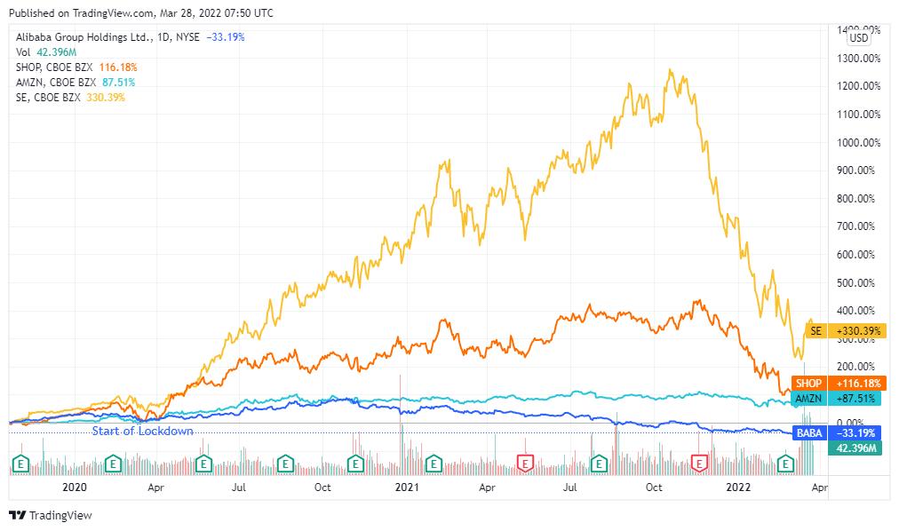 E-commerce sales are receding as the economies open up. The growth is now stabilizing at its long-term uptrend.