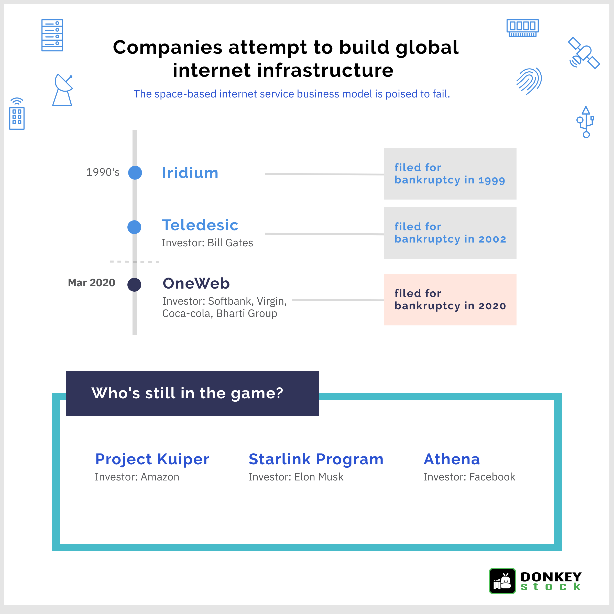 · Teledesic, a company backed by Bill Gates, wanted to beam broadband internet from orbit, but only launched a single satellite before filing for bankruptcy protection in 2002.